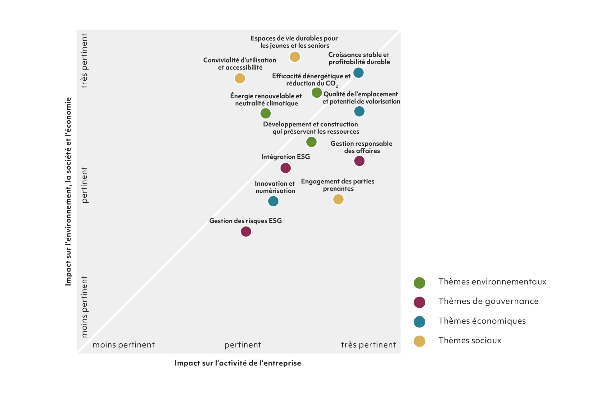Novavest Real Estate AG a identifié les thèmes essentiels suivants et les a représentés dans la matrice de matérialité ci-dessous. Afin d’assurer une évaluation équilibrée, les aspects économiques, environnementaux, sociaux et de gouvernance pertinente ont été pris en compte.